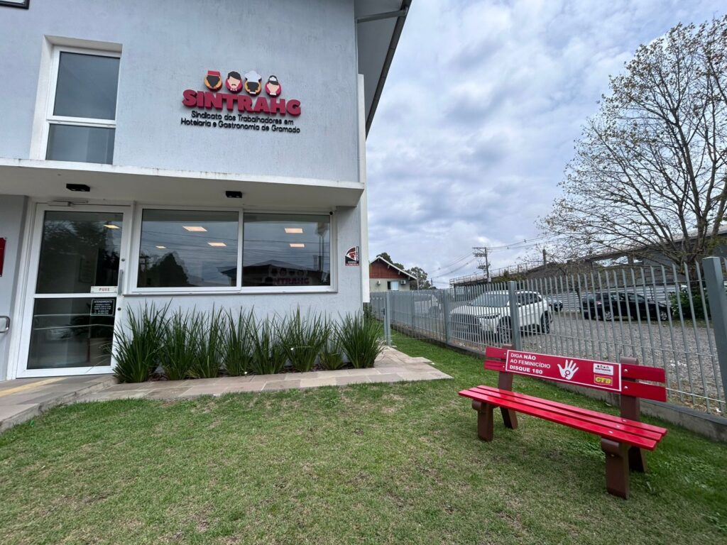O Sindicato dos Trabalhadores em Hotelaria e Gastronomia de Gramado (SINTRAHG) inaugurou, na segunda-feira (30), um Banco Vermelho em frente à sua sede, em Gramado. A iniciativa integra uma mobilização nacional de conscientização e enfrentamento à violência contra as mulheres, especialmente o feminicídio.